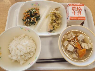 ごはん、牛乳、ミルメーク(ココア)、鮭のちゃんちゃん焼き、ほうれん草のごまあえ、けんちん汁