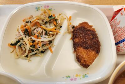 ごはん、牛乳、県産カジキカツ、県産もやしのごま油あえ、県産里芋のそぼろ煮