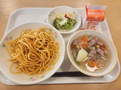 スパゲティナポリタン、牛乳、りんごとブロッコリーサラダ、ポトフ