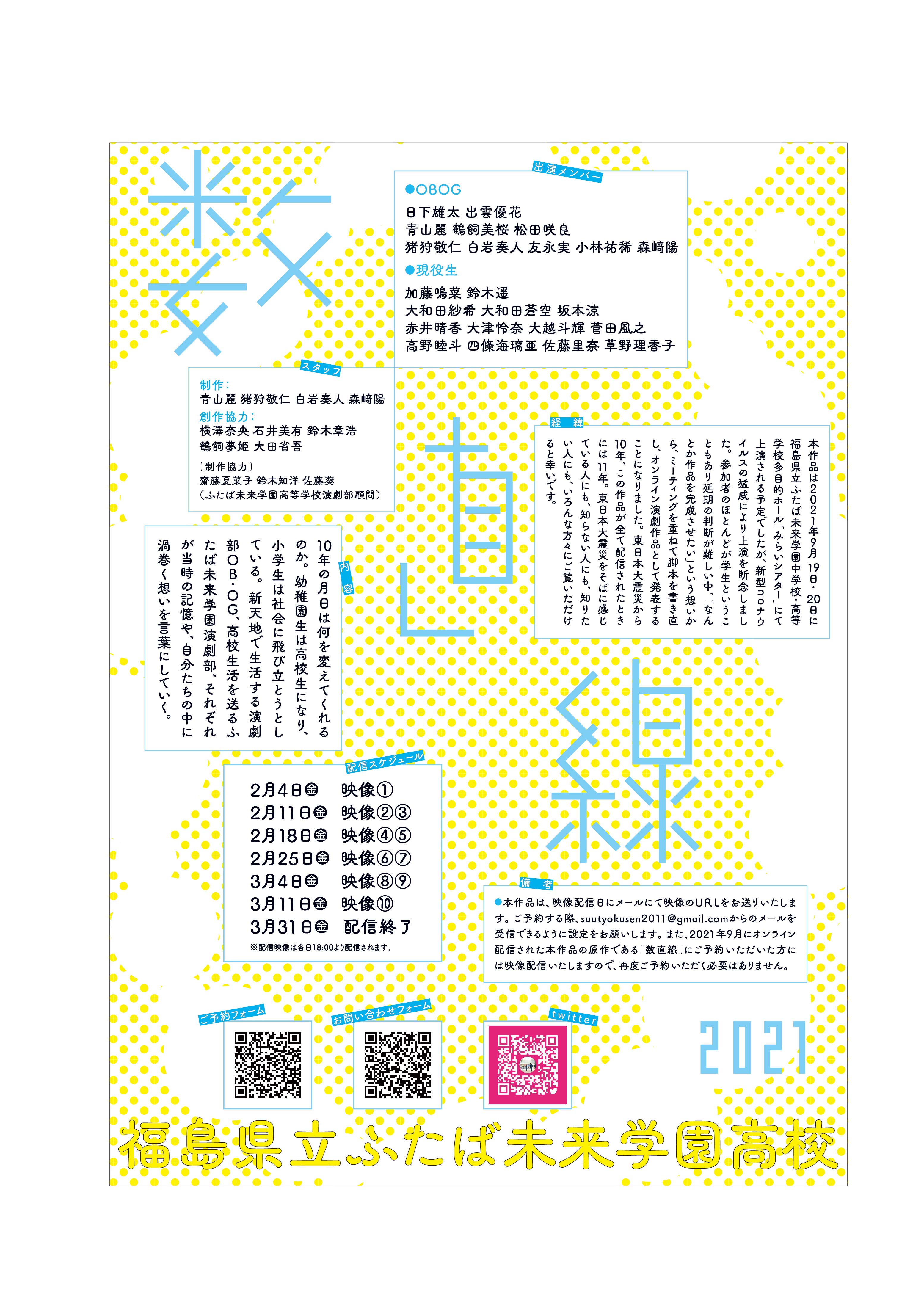 2021年9月19日・20日に福島県立ふたば未来学園中学校・高等学校多目的ホール「みらいシアター」にて上演される予定でしたが、新型コロナウイルスの猛威により上演を断念しました。参加者のほとんどが学生ということもあり延期の判断が難しい中、「なんとか作品を完成させたい」という想いから、ミーティングを重ねて脚本を書き直し、オンライン演劇作品として発表することになりました。東日本大震災から10年、この作品が全て配信されたときには11年。東日本大震災をそばに感じている人にも、知らない人にも、知りたい人にも、いろんな方々にご覧いただけると幸いです。