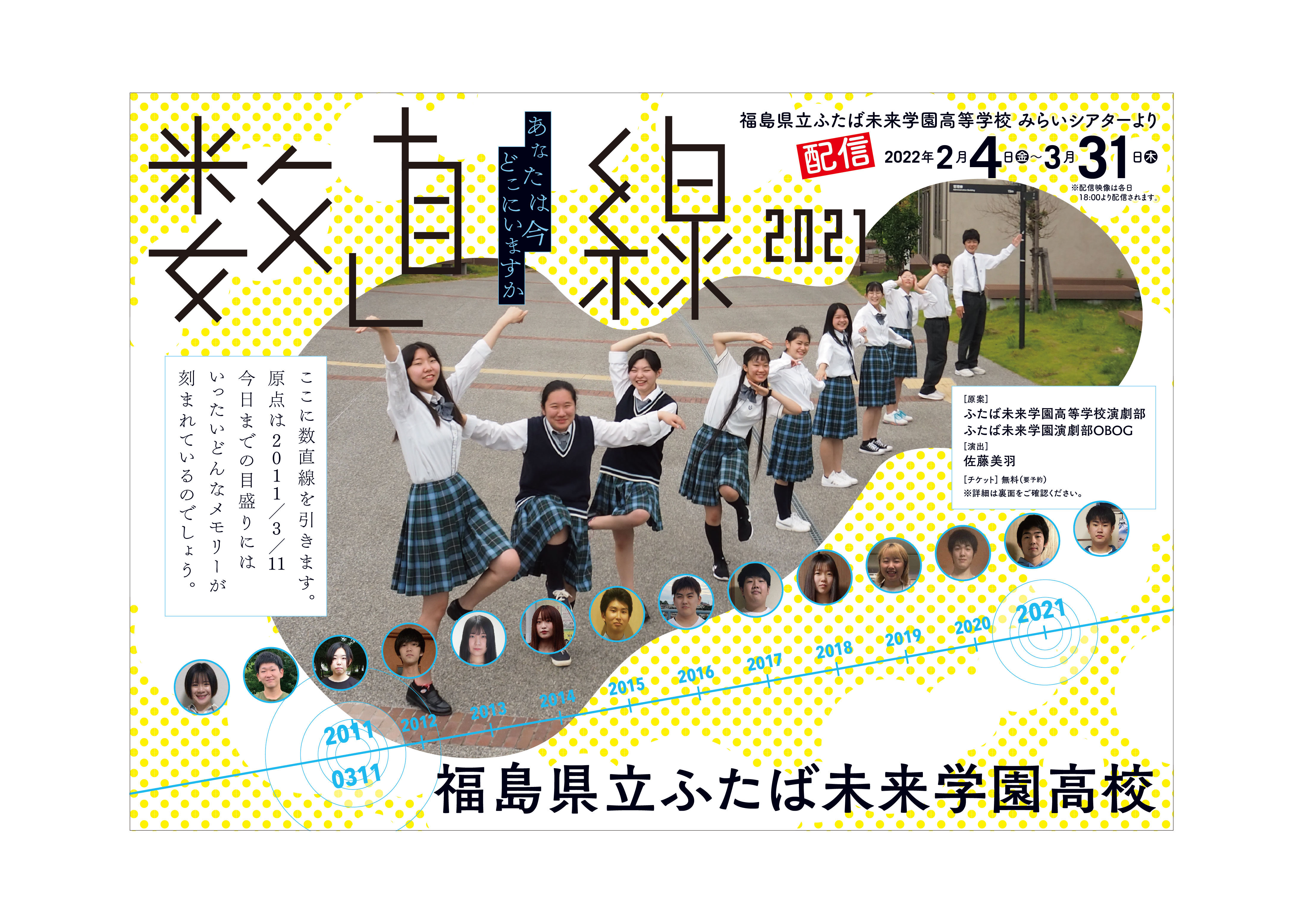 本作品『数直線2021』の基となったのは、2016年に本校演劇部によって作られたオリジナル演劇作品『数直線』です。当時、部員一人一人が自らの言葉・表現を探りながら、震災・原発事故以降の自分たちを取り巻く状況をテーマに取り組み、東京でも上演をいたしました。震災から10年が経ち、当時と現在の部員たちが協力し、作品をリメイクすることになりました。