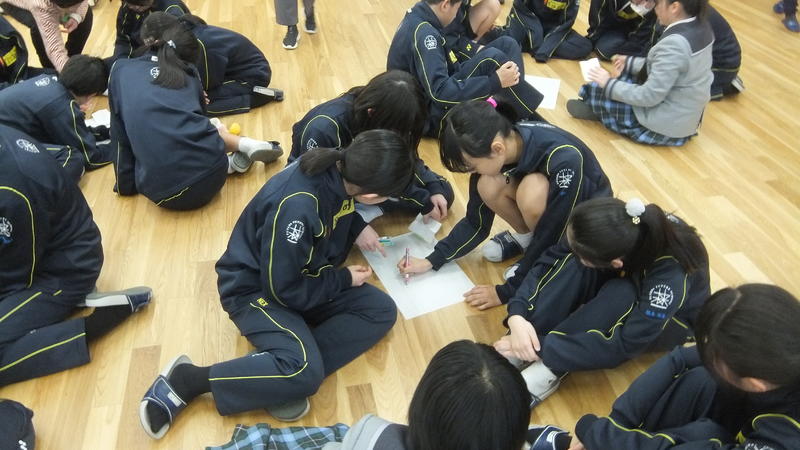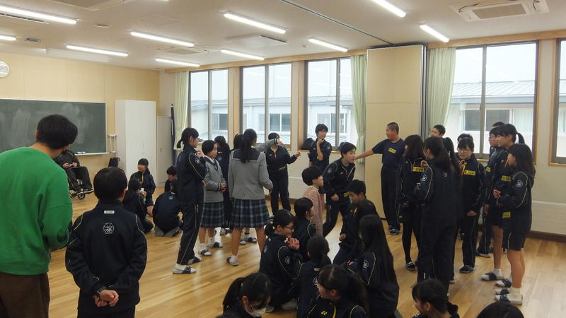 まずは仲間捜しゲーム。生徒たちは決められた条件の中で声を掛け合いながら仲間を作ります。積極的に声を掛けてくれる心優しい生徒がたくさんいて、仲間作りがスムーズに進みます。よい光景です。